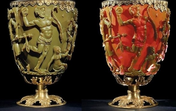 녹색의 옥빛 유리로 제작된 이 컵은 밝은 빛을 비출시 내부가 핏빛으로 붉게 물들며 반짝이는 특징을 가지고 있습니다. 이렇게 색이 변하는 유리는 '이색성 유리'라고 하는데요 이런 기술은 20세기 중반이 넘어 개발된 것입니다. 1700년 전의 고대 로마에서 어떻게 이 컵을 만들었는지가 미스터리입니다.