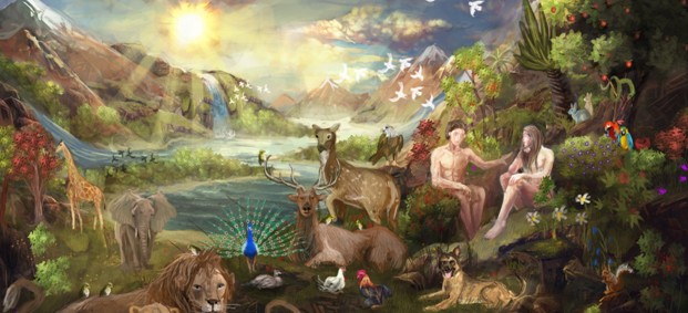 태초의 인간, 아담과 하와가 머물던 지상 낙원 에덴 온갖 나무와 모든 종류의 동물들이 있는 아름답고 풍족한 땅이었습니다.